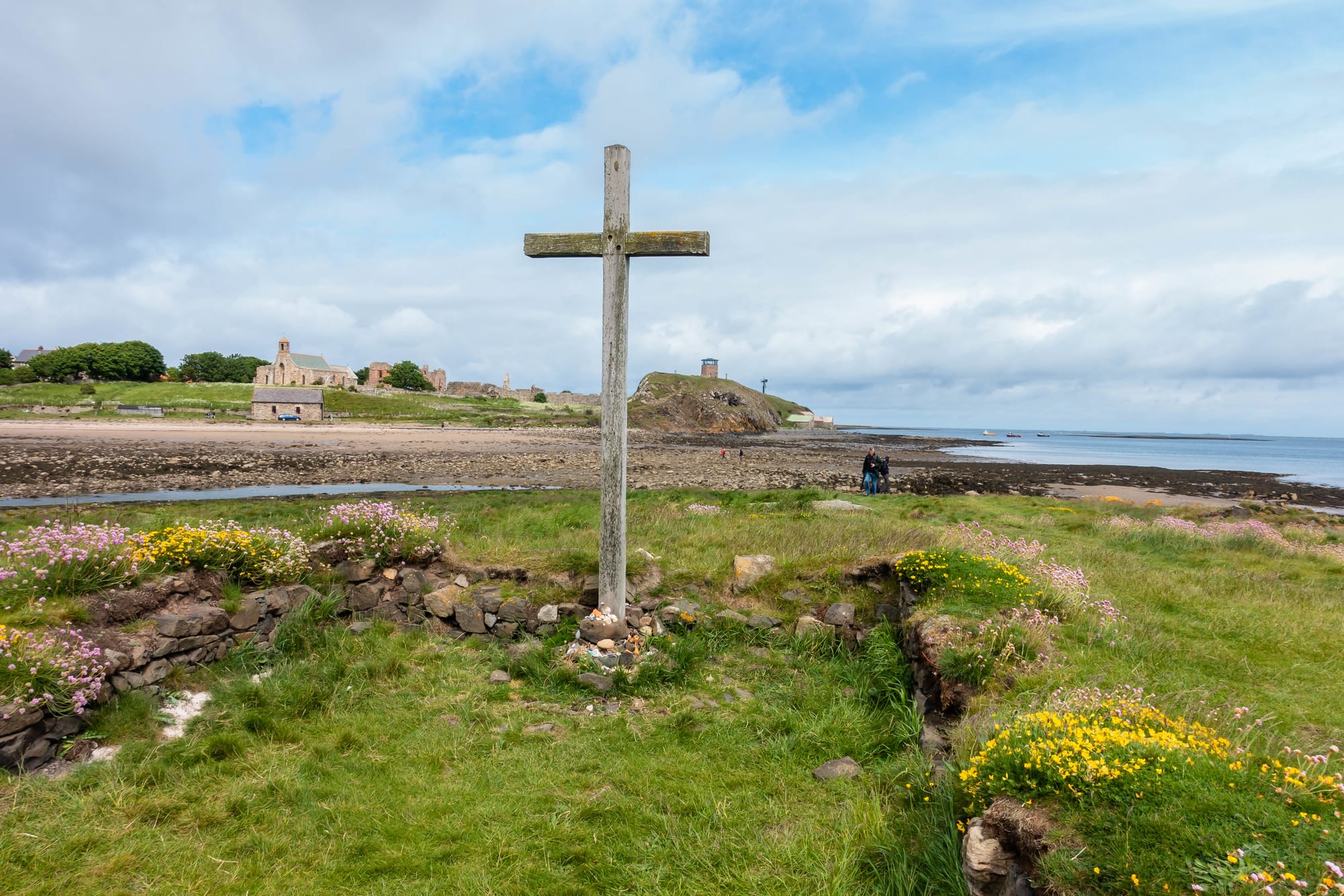 Du petit cimetière à côté du Prieuré de Lindisfarne, tu peux apercevoir l'Île de Saint Cuthbert. Quand la marée est basse, tu peux marcher sur les rochers et profiter de la vue sur la mer et les plages de Lindisfarne de loin.