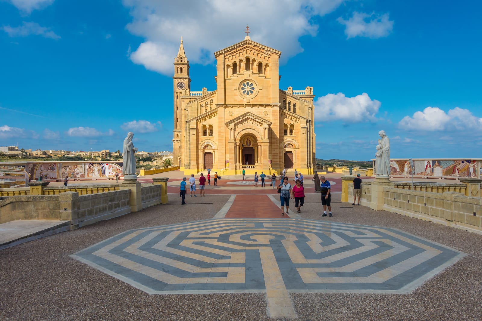 This church, entwined with myths and legends, dates back to 1534. As soon as you come closer, you'll see two massive curved mosaic walls adorning the Gozitan Basilica.