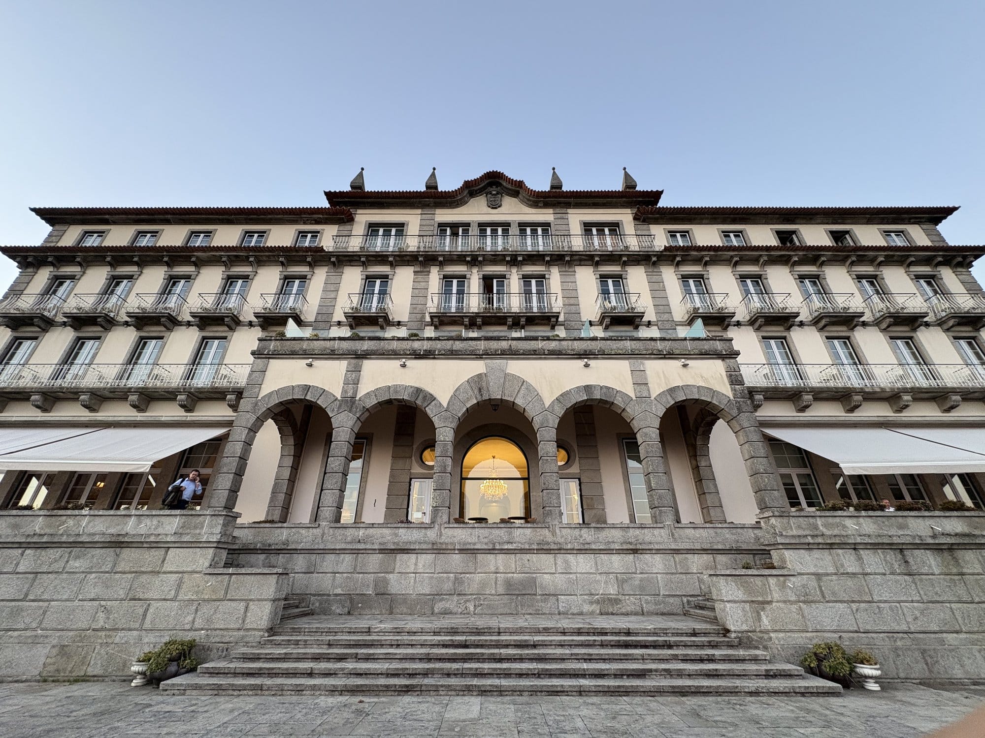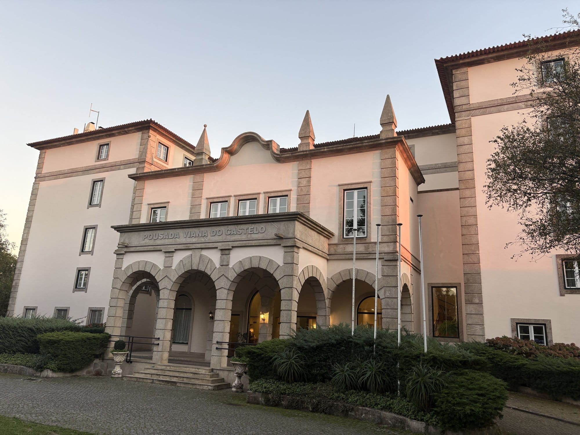 The Pousada (historic hotel) at the hilltop is an elegant building with colonnaded arcades in granite — worth admiring even if you're not staying there. The architecture catches the last light of the afternoon beautifully.